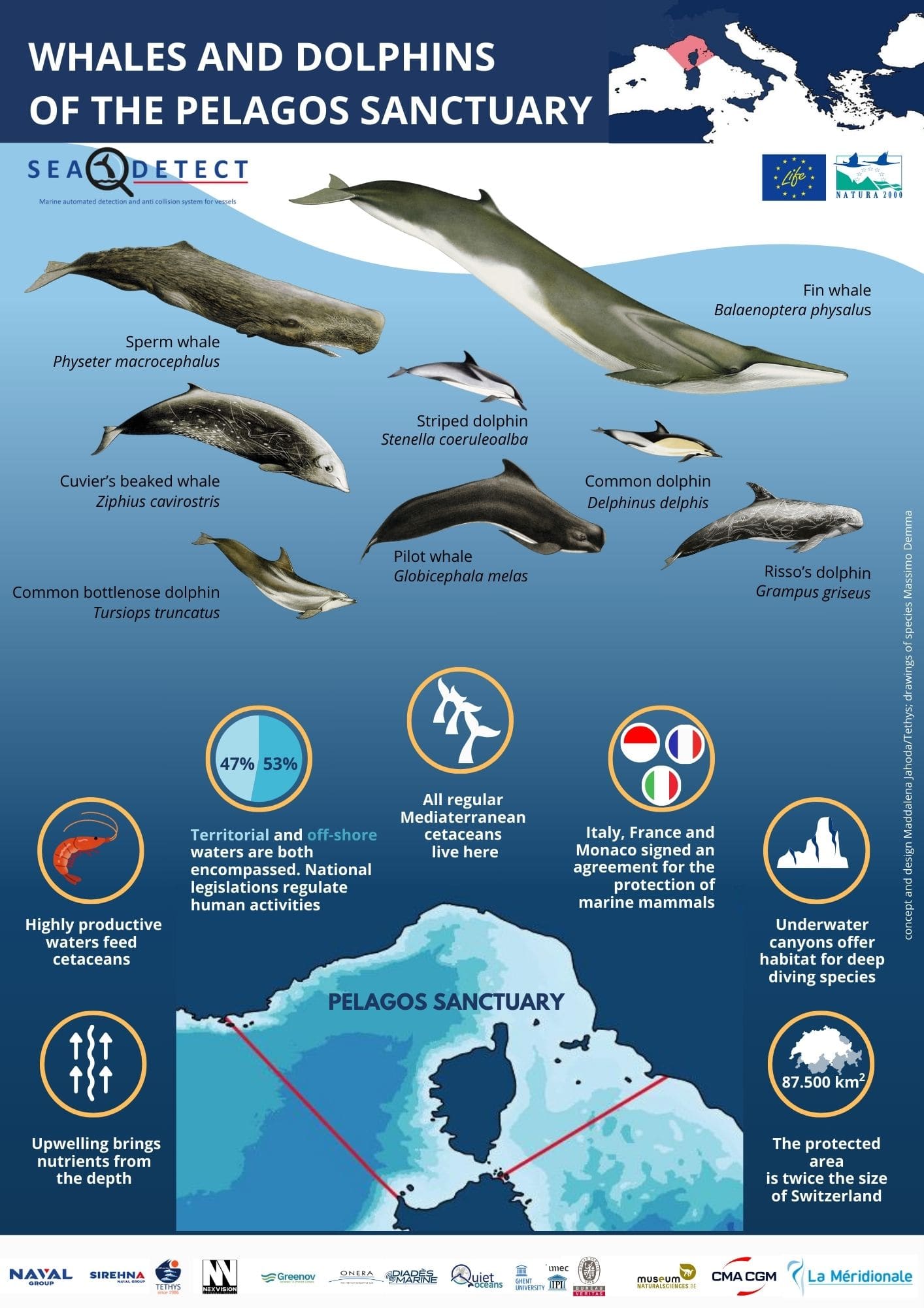 LIFE-SEADETECT is a European collaborative project involving participating organisations from 3 countries (France, Belgium, Italy). The project is aimed at creating an automated system for reducing the risk of collision between vessels and marine mammals or other floating obstacles.
