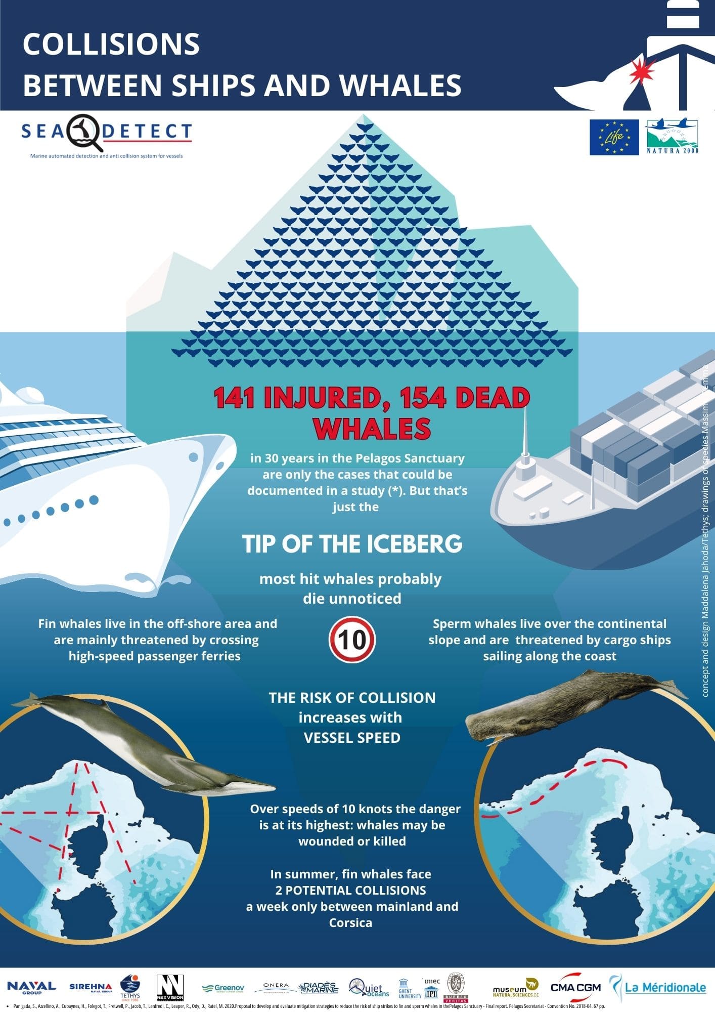 Collisions with boats, particularly high-speed ones, are among the leading causes of non-natural mortality for large cetaceans in all oceans, but especially in the Pelagos Sanctuary (North-Western Mediterranean), a high-risk area, due to a high density of both cetaceans and vessels. It has been estimated that along the route of large ships to and from Corsica in summer there are no less than two potential collisions per week. Passenger ships cross risk-areas 60% of the time, and maritime traffic has increased by 50% in the last decade alone. Eight to 40 fin whales per year are estimated to potentially suffer a collision event, but figures are largely underestimated, since only known cases are being taken into account.